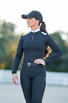 This feminine, eye catching show shirt is created for comfort and designed to performance. Beveled collar, pearl snaps and princess cut shoulders. Jersey mesh cuffs and back deep V panel. She’s sleek, chic and ready for the show ring!