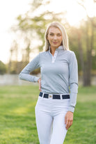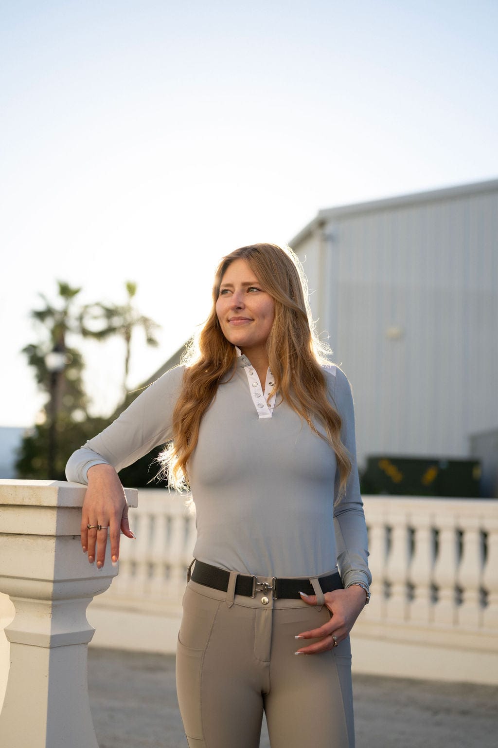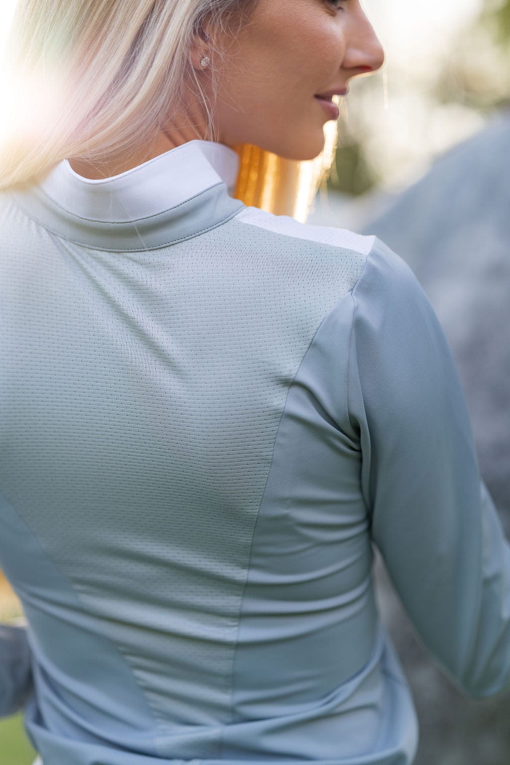 This feminine, eye catching show shirt is created for comfort and designed to performance. Beveled collar, pearl snaps and princess cut shoulders. Jersey mesh cuffs and back deep V panel. She’s sleek, chic and ready for the show ring!
