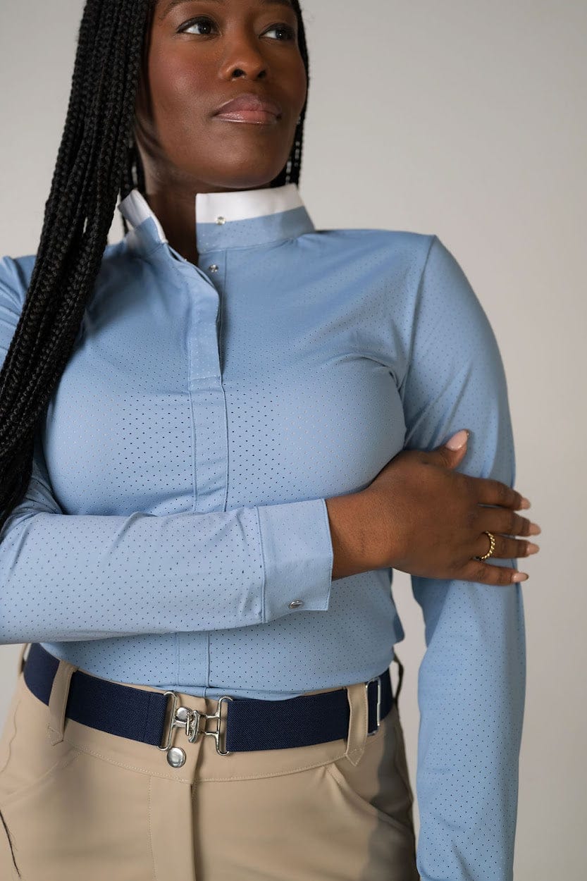 Introducing the Kate Show Shirt: where high performance meets sophisticated style. Crafted from advanced moisture-wicking fabric, this shirt ensures you stay cool and dry even during the most intense competitions. The breathable material quickly draws sweat away from your skin, keeping you comfortable and focused.