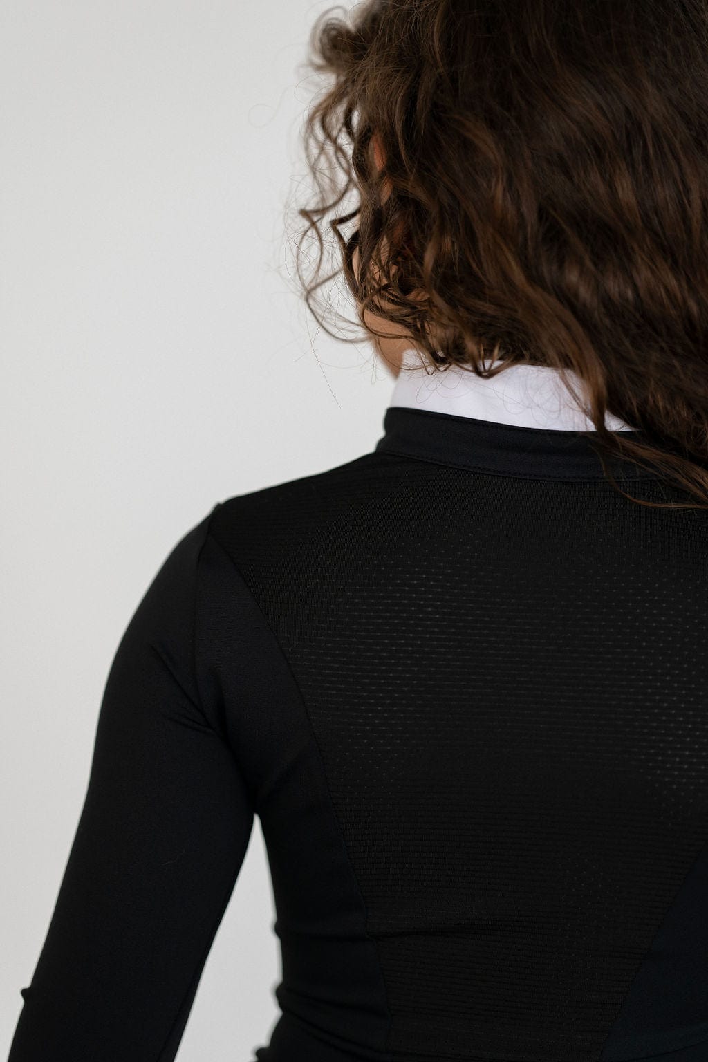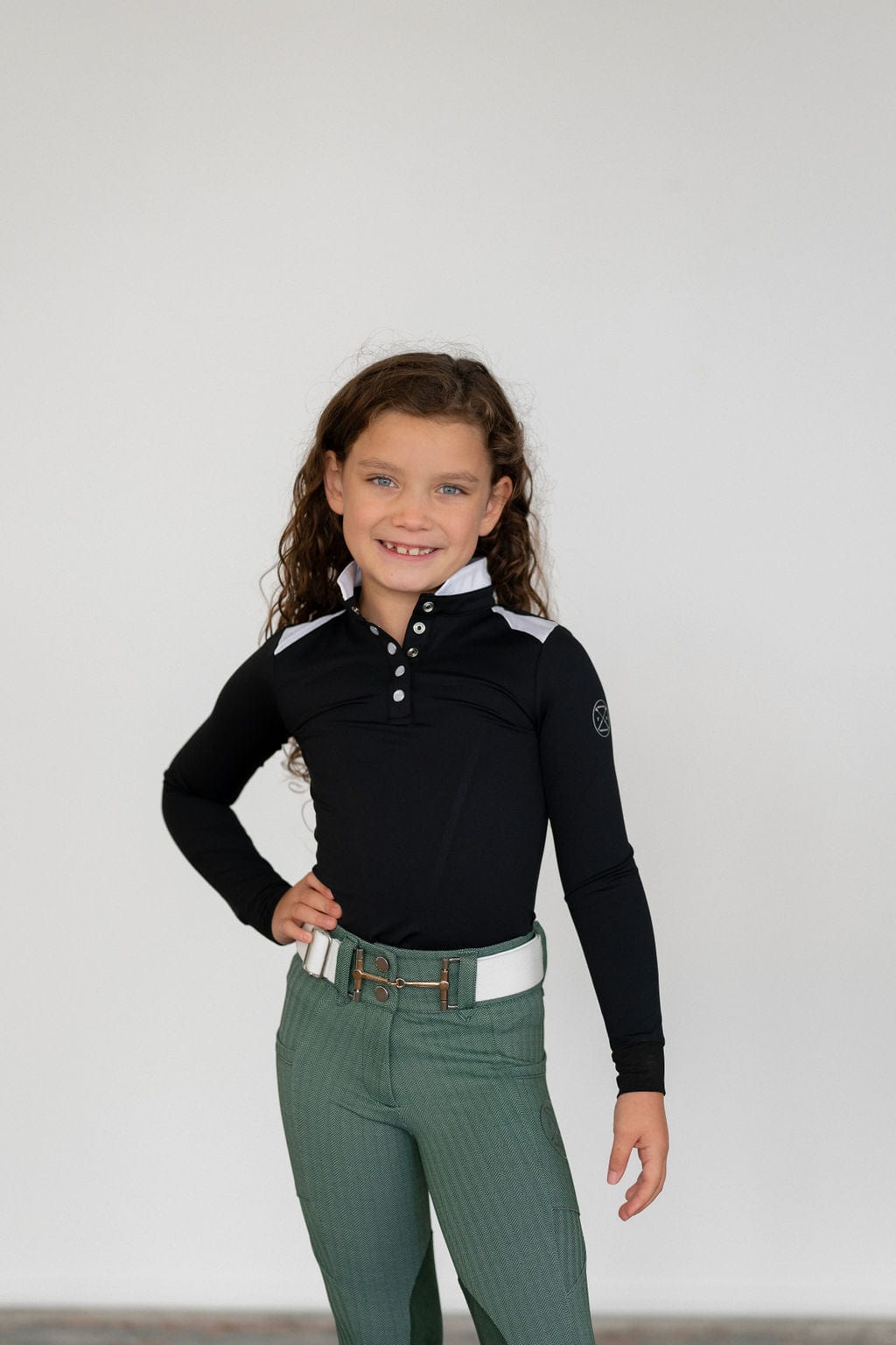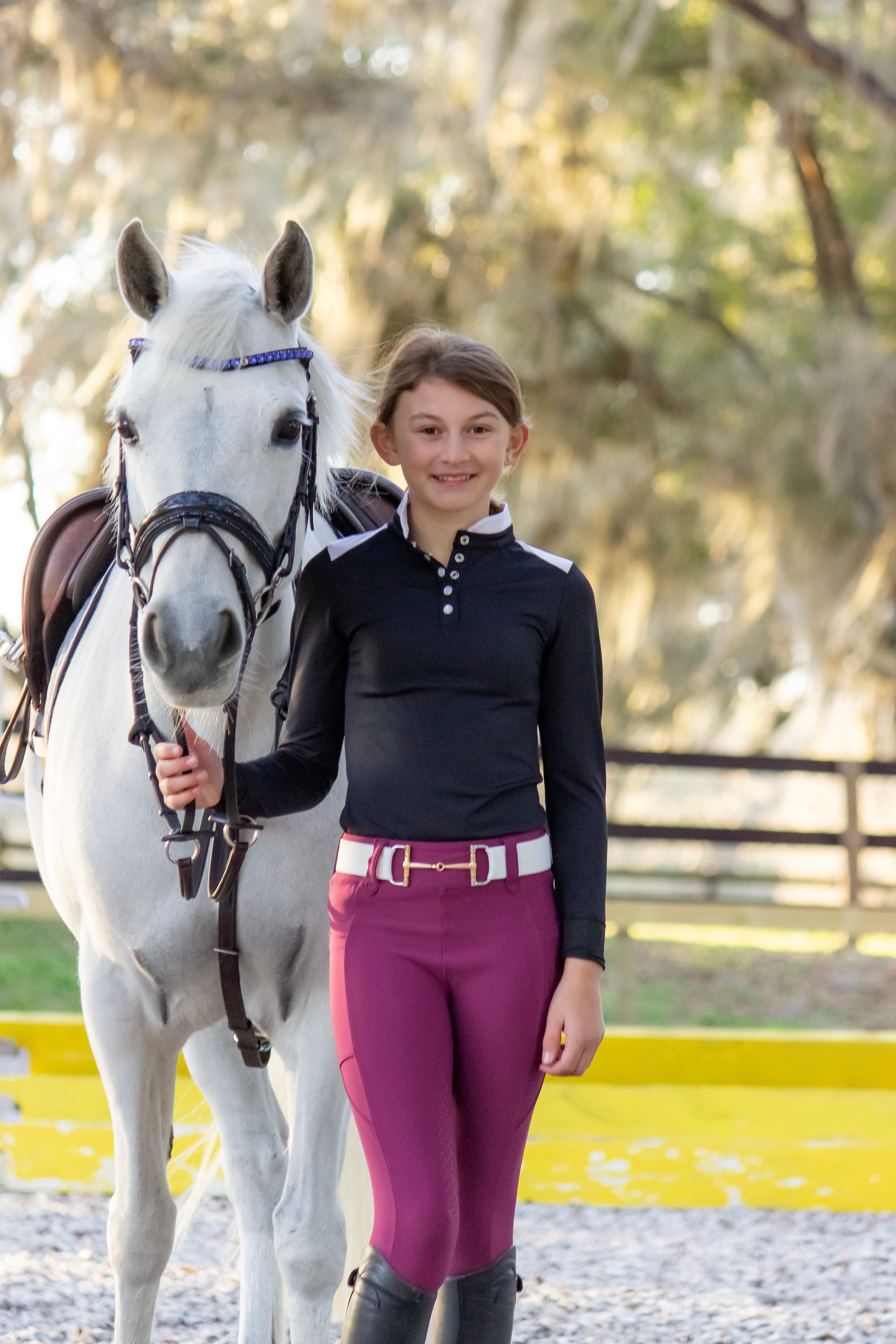 This feminine, eye catching show shirt is created for comfort and designed to perform. With its beveled collar, pearl snaps and princess cut shoulders. Jersey mesh cuffs and back deep V panel. She’s sleek, chic and ready for the show ring!