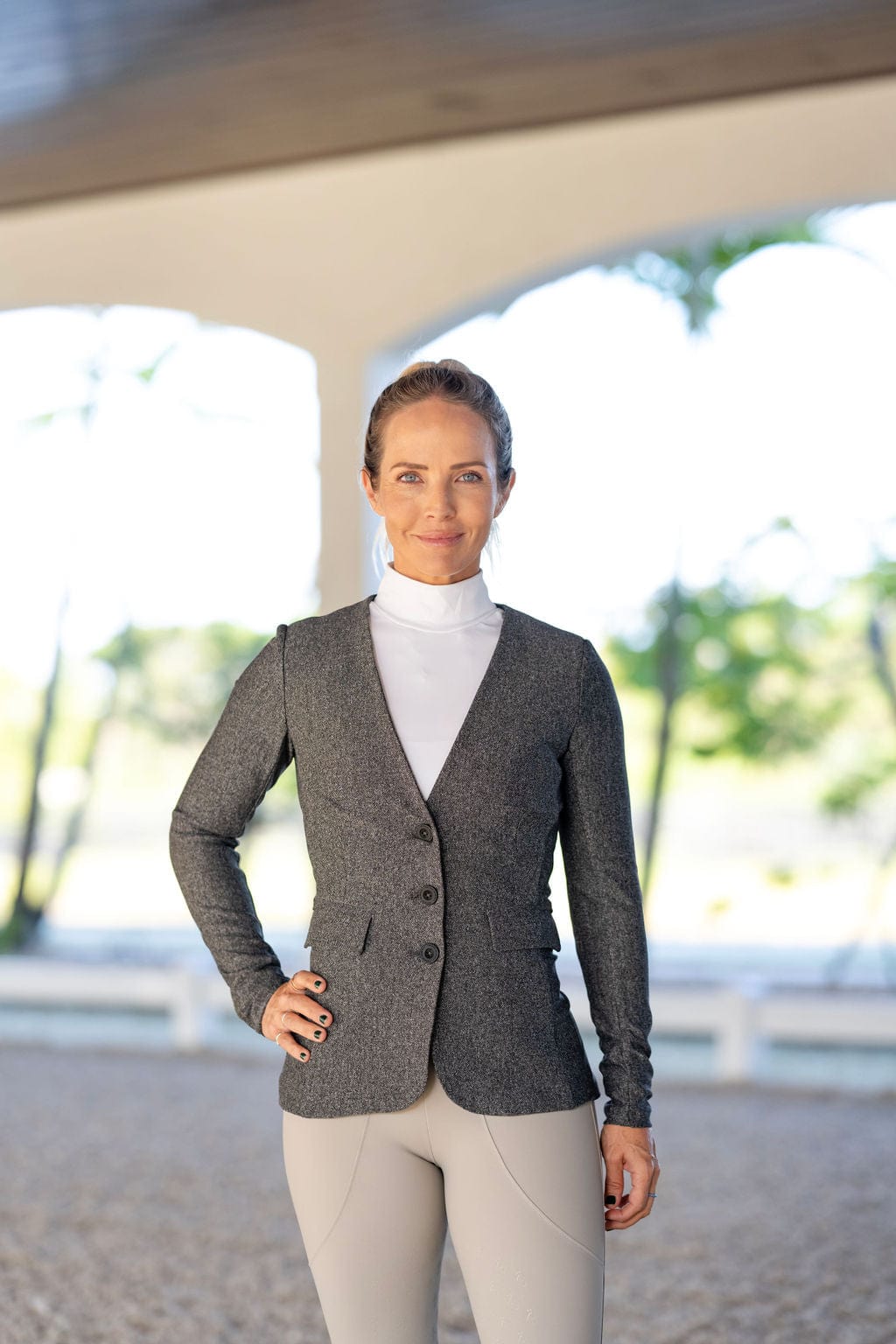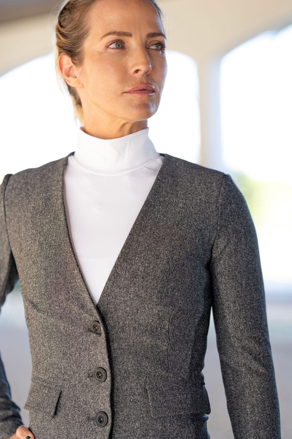 Introducing the Ashlee Bond x Free Ride Equestrian Tweed Hunt Coat. The textured yet stretchy and breathable tweed fabric offers the rider a free range of motion, while maintaining the tradition of the sport. The midweight fabric provides extreme comfort and breathability while the feminine details offer a classic contrast. These elements combine grace and beauty with high performance making it the ideal coat for all equestrian athletes.